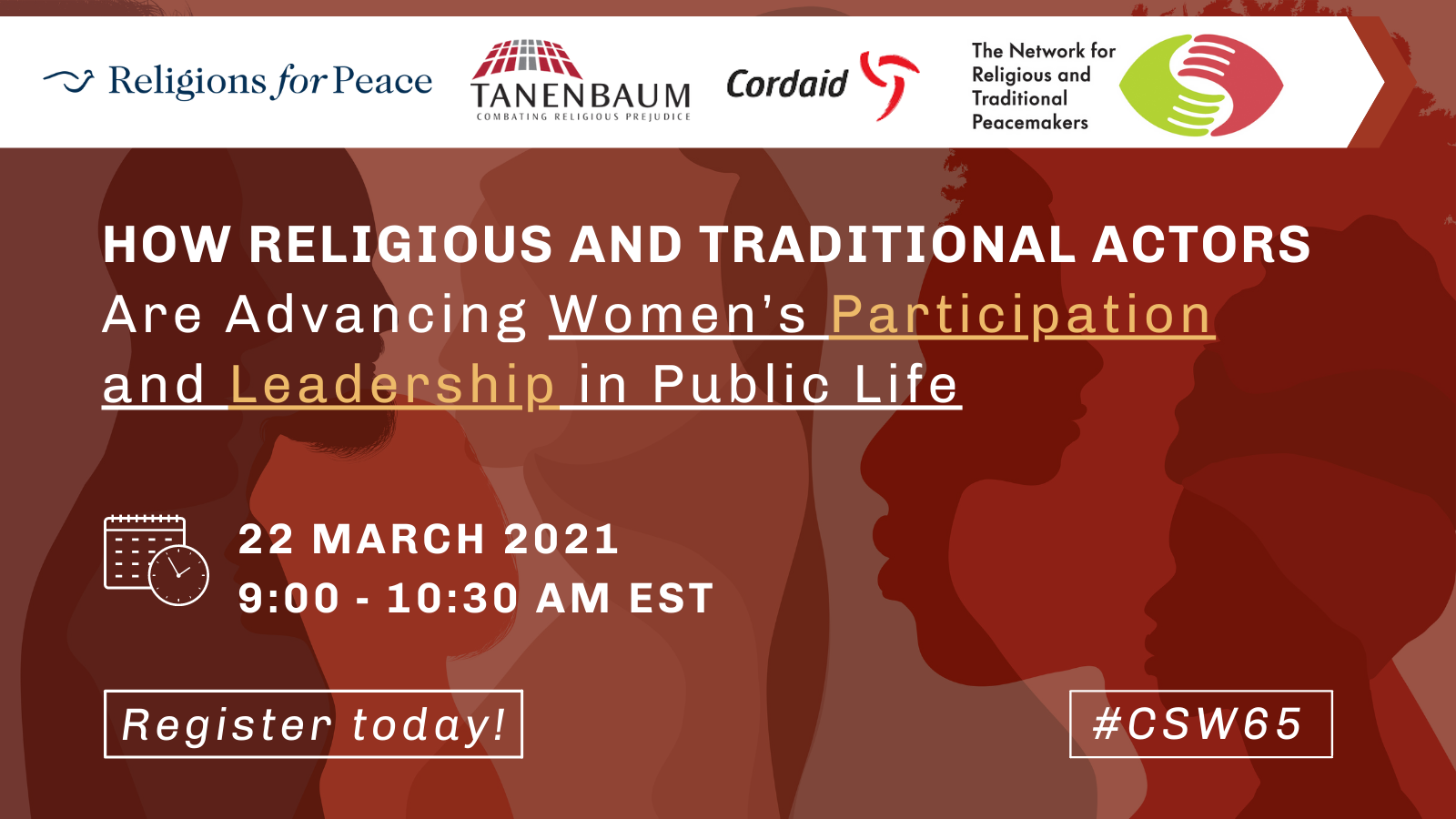 On Monday, March 22, from 9:00-10:30 AM EST, the Network for Religious and Traditional Leaders, Cordaid, the Tanenbaum Center for Interreligious Understanding, and Religions for Peace will host the event, “How Religious and Traditional Actors Are Advancing Women’s Participation and Leadership in Public Life,” as part of the Sixty-Fifth Session of the Commission on the Status of Women (CSW).