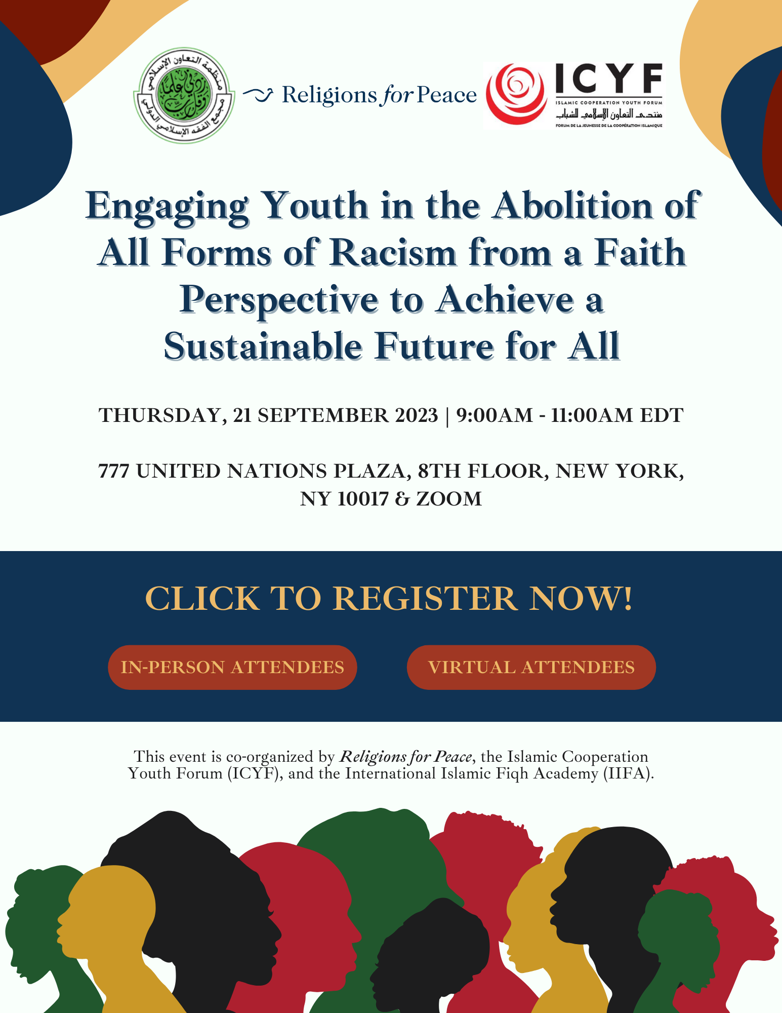 We are pleased to invite you to a hybrid panel discussion on Engaging Youth in the Abolition of All Forms of Racism from a Faith Perspective to Achieve a Sustainable Future for All, co-organised by Religions for Peace, the Islamic Cooperation Youth Forum (ICYF), and the International Islamic Fiqh Academy (IIFA). The side event will be held on the margins of the 78th United Nations General Assembly (UNGA 78) on Thursday, 21 September from 9:00AM – 11:00AM EDT at 777 United Nations Plaza, 8th Floor, New York, NY 10017, with the option to participate via Zoom.