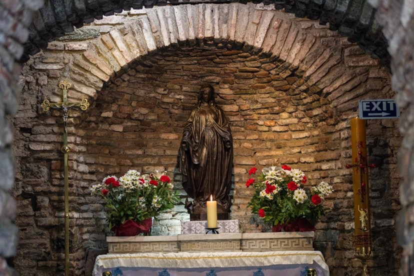 The House of Mary (Meryemana Evi) is located on the Nightingale Mountain (Bülbül Dağ) above the ancient city of Ephesus. The site was excavated at the end of the nineteenth century and became a local pilgrimage site. It is recognized as an important Christian holy place, as confirmed by the visits of several popes (Paul VI, John Paul II, and Benedict XVI) and by the presence of Catholic friars and nuns. As the figure of Mary is an important figure in Islam, many Muslims also visit this site to honor her. The space has multiple shared uses by Orthodox, Catholic, and Protestant Christians and Muslims: Christians use the altar to pray, while Muslims pray towards Mecca; Christians, Muslims and visitors of other religions light candles and place them in stands outside the House; and the center’s shop, where people can buy objects related to Mary, is owned by a Muslim vendor.[6]